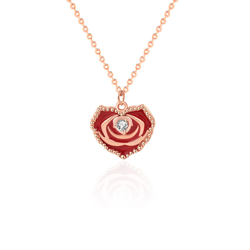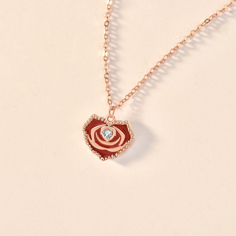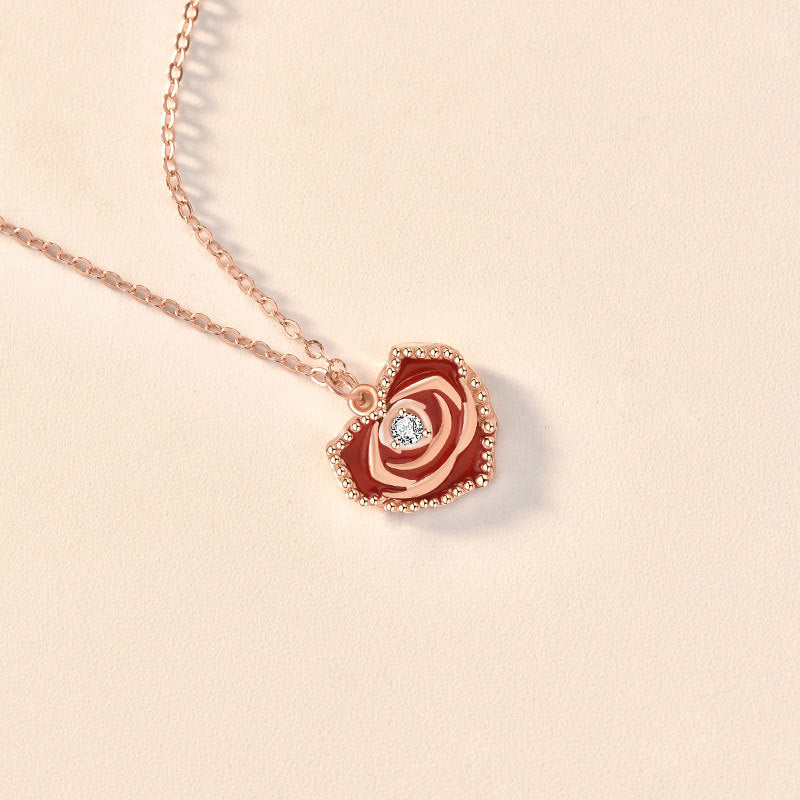 Beautiful Red Rose Flower Heart CZ 925 Sterling Silver Necklace