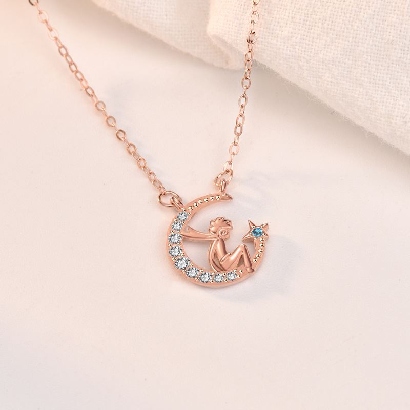 The Little Princ and His Crescent Moon Star 925 Sterling Silver Necklace