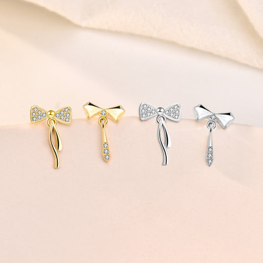 Sweet Asymmetry CZ Bowknot 925 Sterling Silver Dangling Earrings