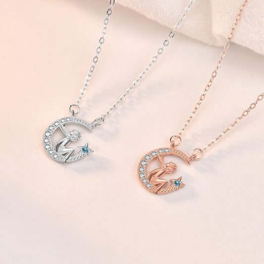The Little Princ and His Crescent Moon Star 925 Sterling Silver Necklace