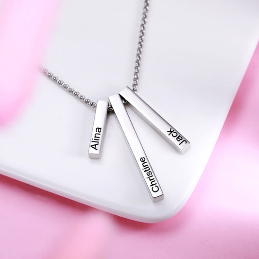 Engraved Triple 3D Vertical Bar Necklace for family names, Personalized Multiple Name Necklace
