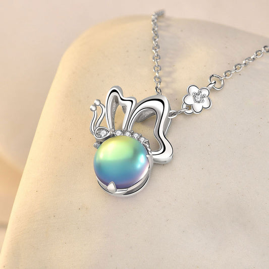 Cute Natural Moonstone CZ Flying Butterfly 925 Sterling Silver Necklace