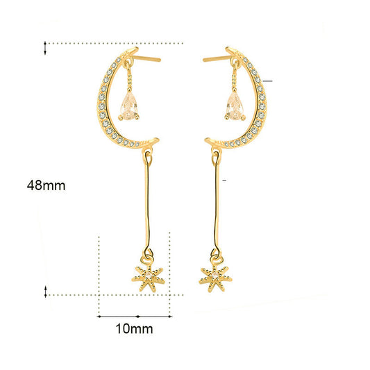 Elegant CZ Crescent Moon Stars 925 Sterling Silver Dangling Earrings