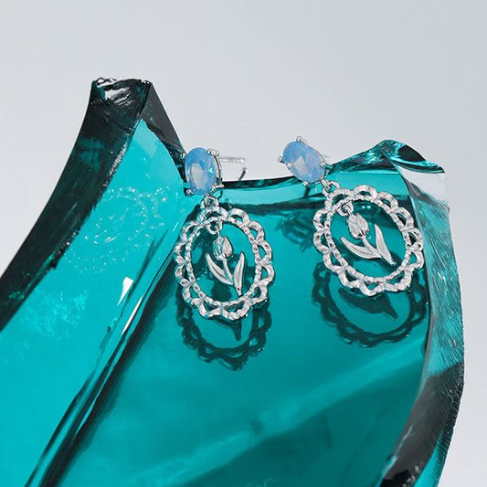 Elegant Blue CZ Tulips Flower 925 Sterling Silver Dangling Earrings